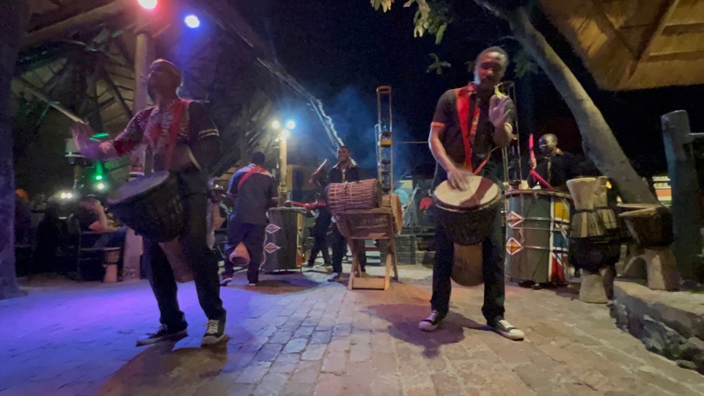 Happily, on this leg of the trip my sister Becky and brother-in-law Matt joined us on our adventure. They stayed in Lokuthula, a sister property a short walk away that also hosts the Boma Drum and Dinner Show which we enjoyed very much. Dancing, singing, and audience participation on African drums was fun for the whole family. Pete and Matt even ate the mopane “worm”, a local delicacy (it’s actually a caterpillar that feeds on the mopane tree).