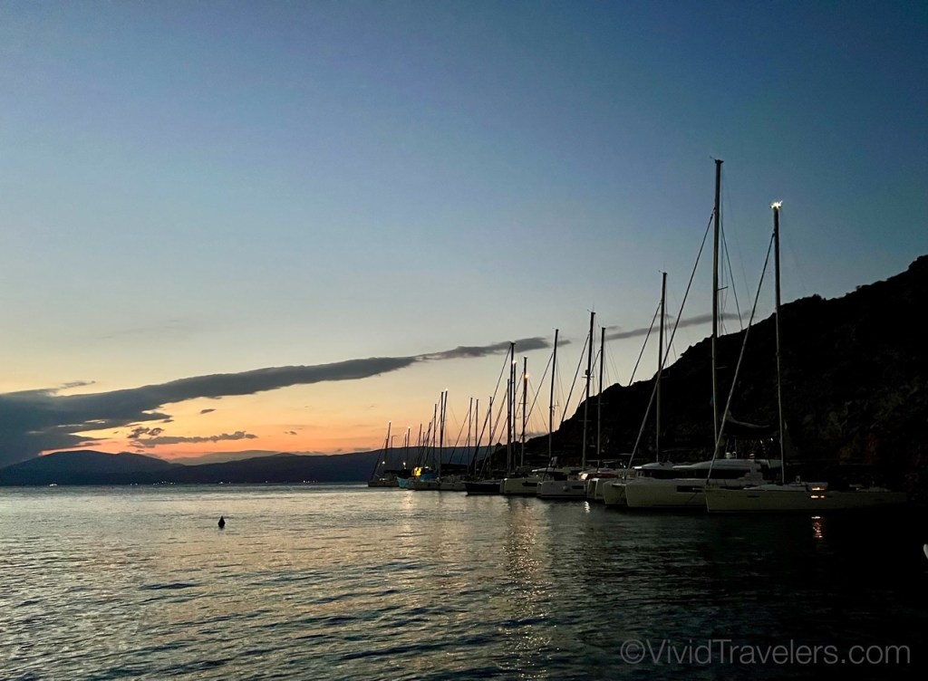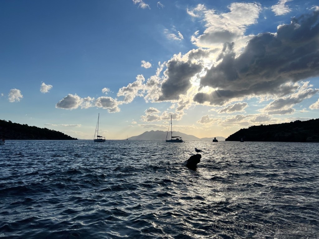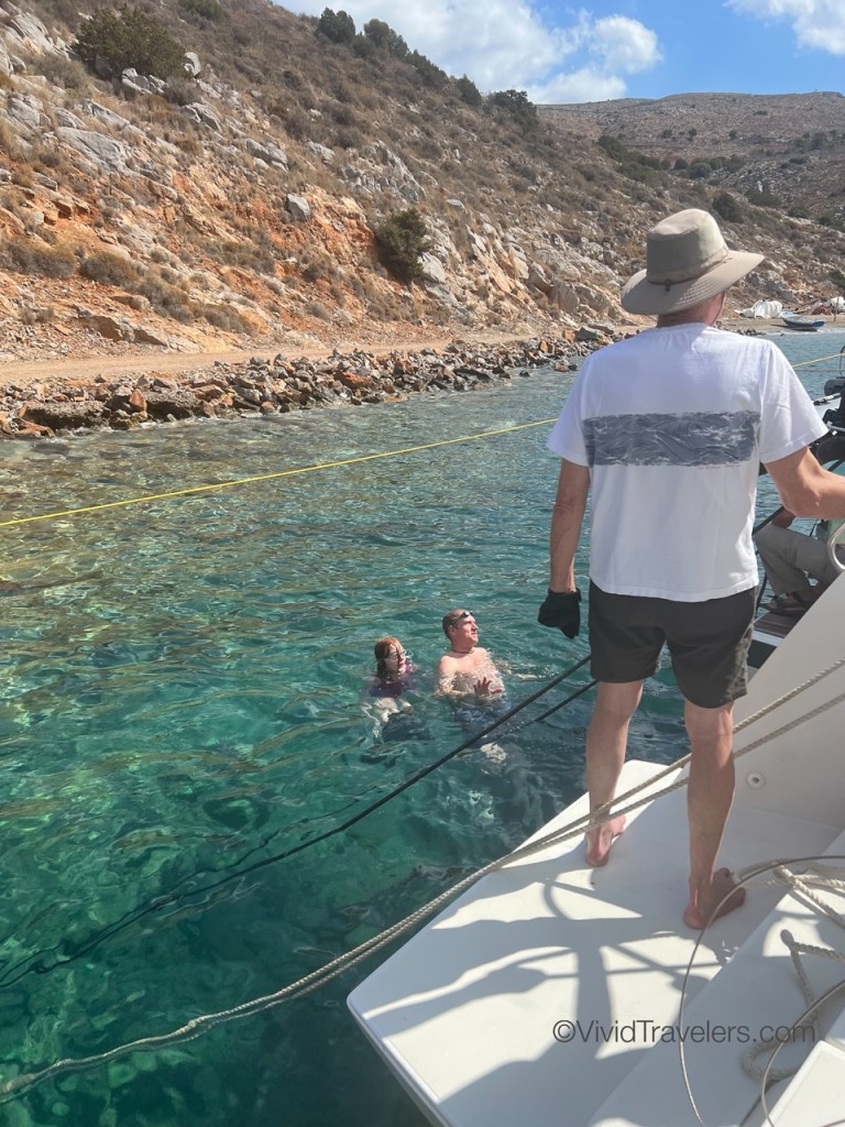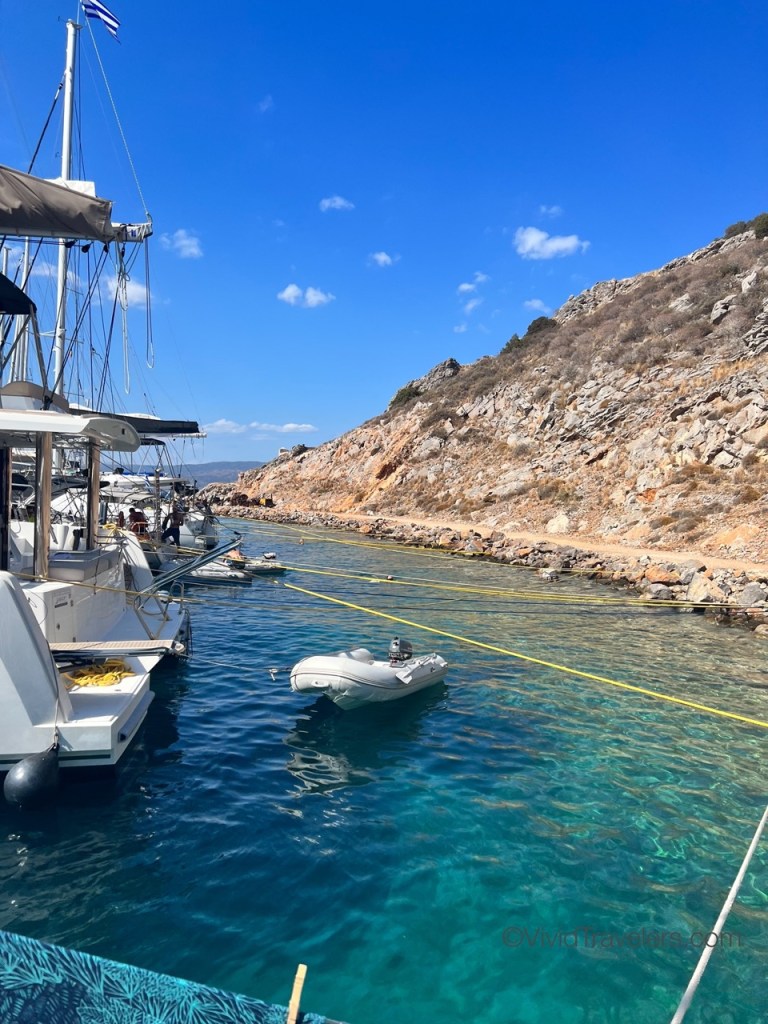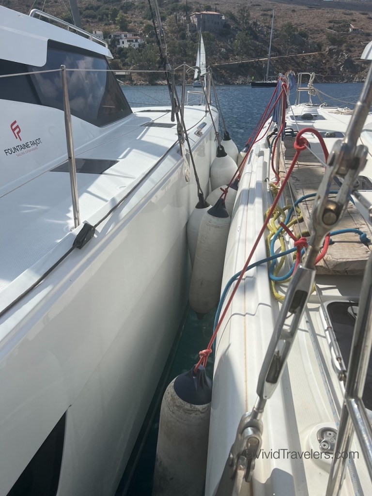 Every place we sail has a slightly different way to dock/anchor/moor and in Greece we did a modified Mediterranean mooring where you drop anchor, back into a space and secure the back corners on shore. This often involves using your neighbor as a bumper, rafting to each other if land-based cleats are in short supply, and/or tying your lines to a rock under water! Sailors are a friendly bunch though, so helping each other out was a great way to make new friends. Just don’t drop your anchor on someone else’s chain please!