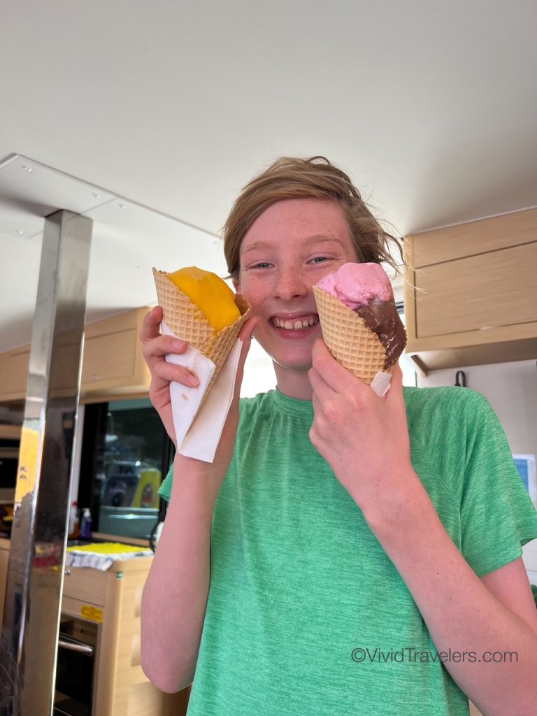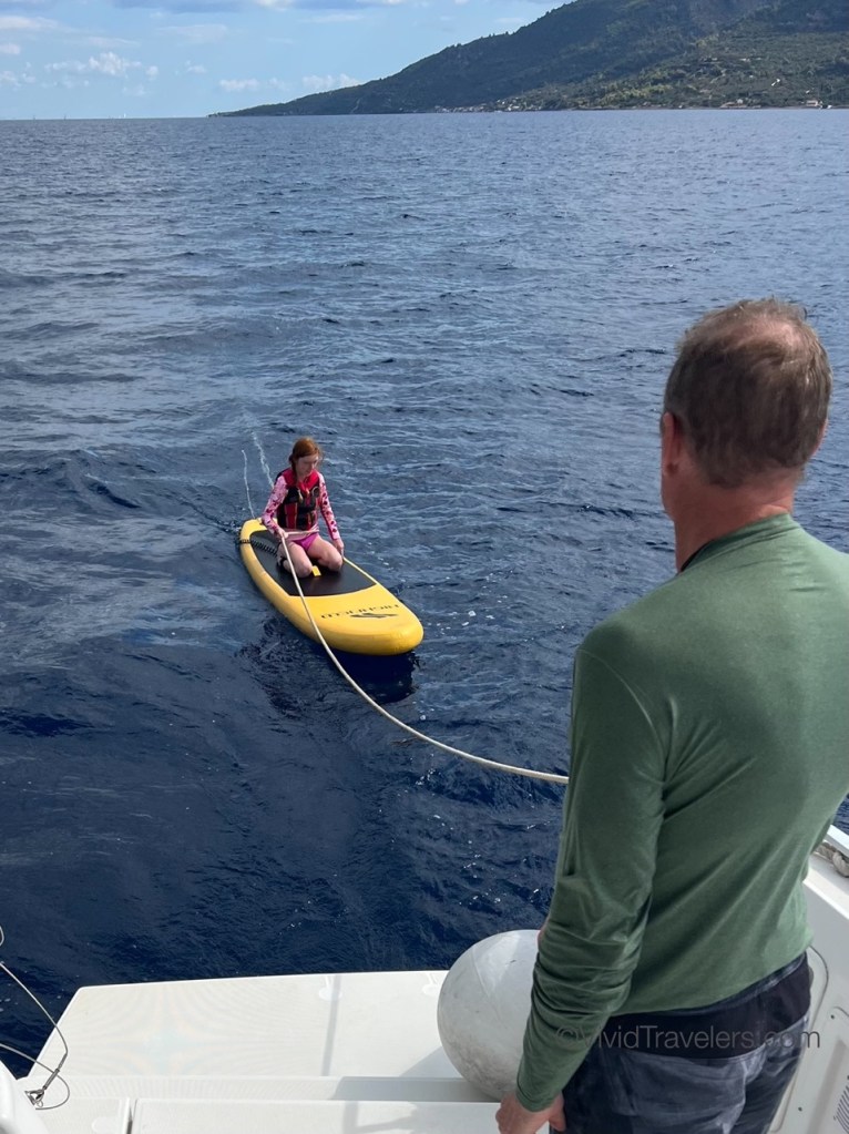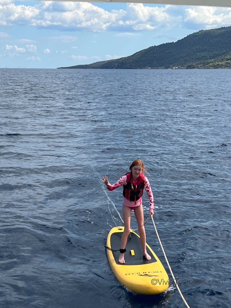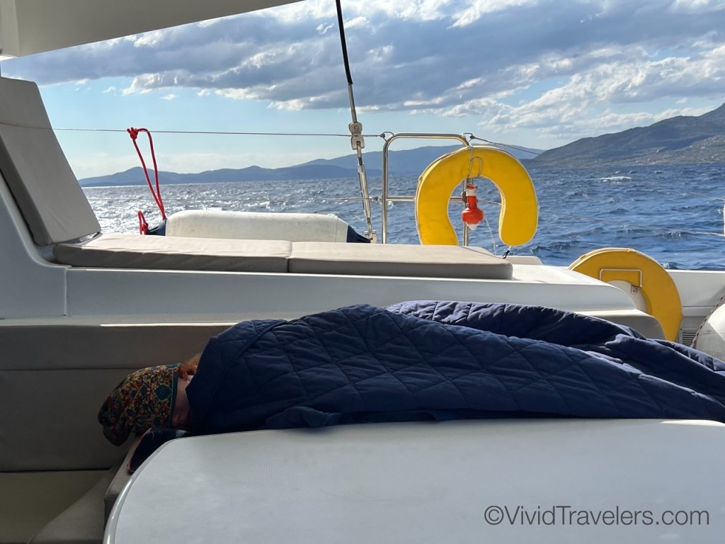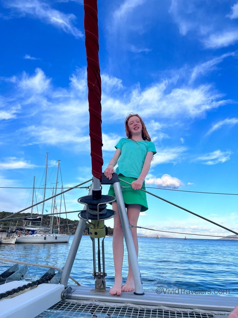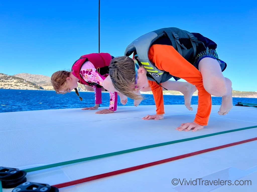 We weren’t worried, but the crossings to and from Athens had high winds and rough waters so we secured the supplies and stuffed things into the cabinets so the dishes didn’t break from all the bouncing around! It can be scary when the boat crests a wave and crashes down to meet the ocean once more, but the kids love it!