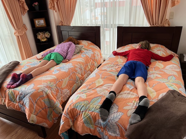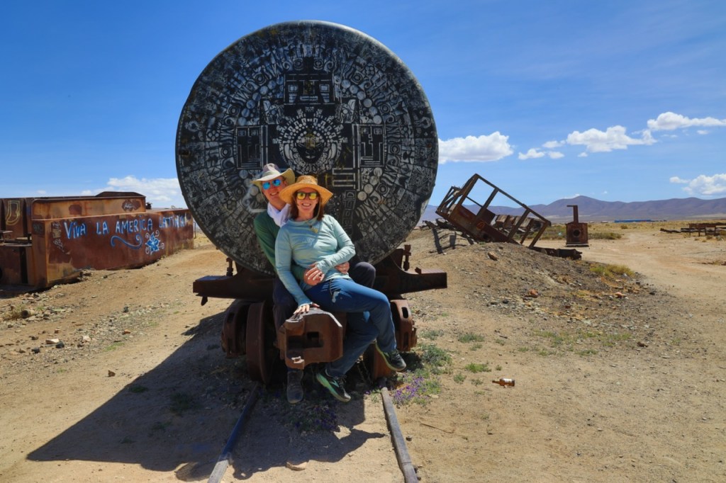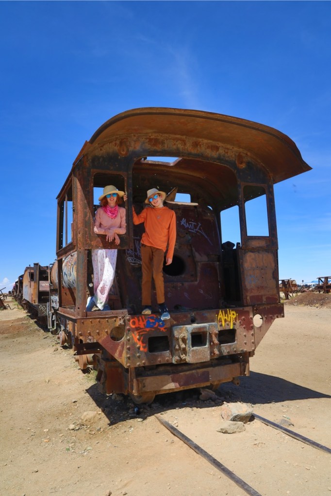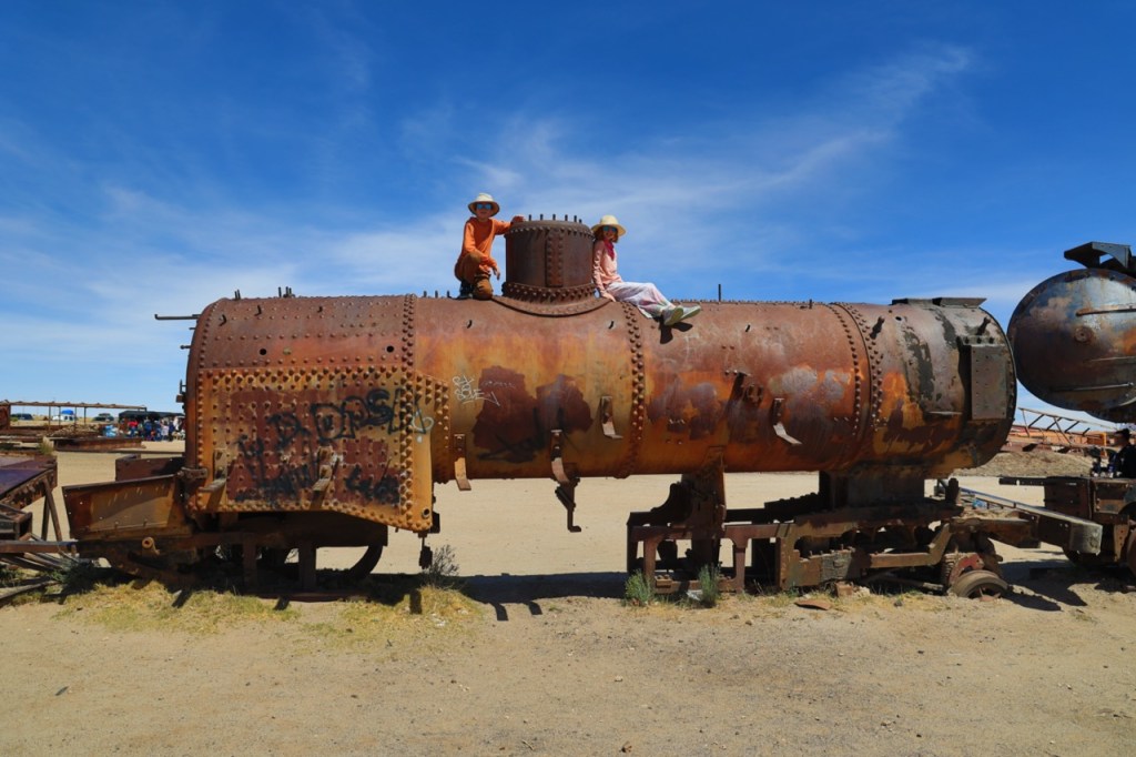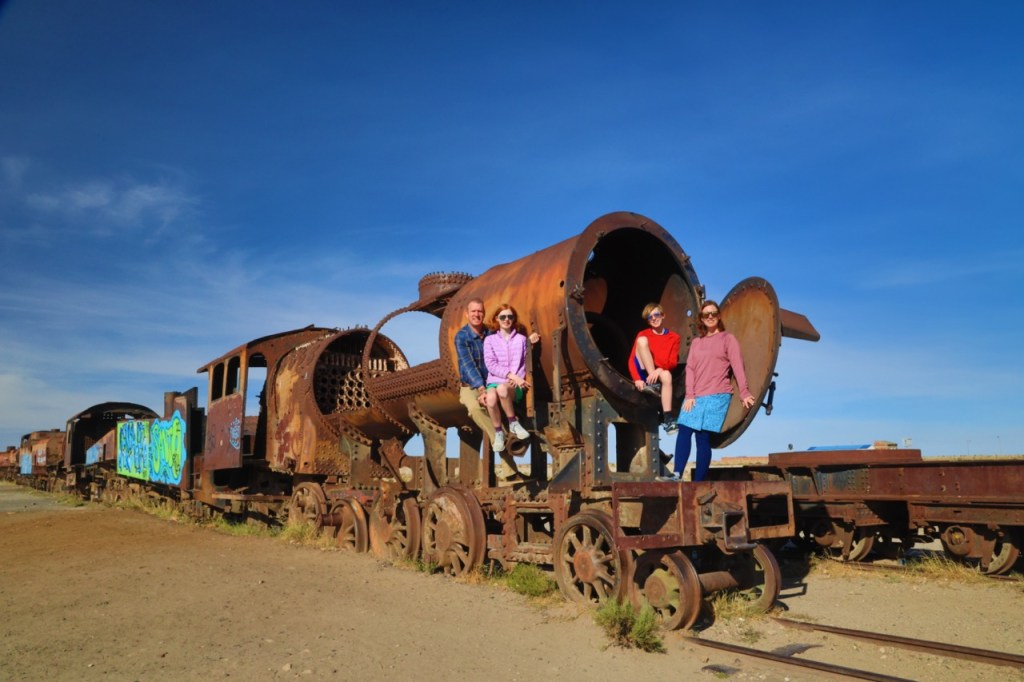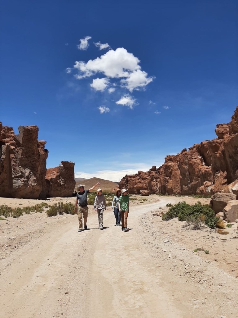 When we left off our story we were watching a sunset near our salt hotel just to the south of Salar de Uyuni, the largest salt flats in the world.  We will now continue our tour with Intrepid Travel which includes a driver and Julia, our guide/local friend/fixer.  We enjoy an occasional small group tour with a guide because we get more information about a place and culture than we might otherwise find.  It is also a lovely break from being “in charge” and having to plan every day!  Julia is a treasure: informative when appropriate, quiet between stops, and friendly with the kids.  She even taught us a new card game!  We hope to see her again someday.