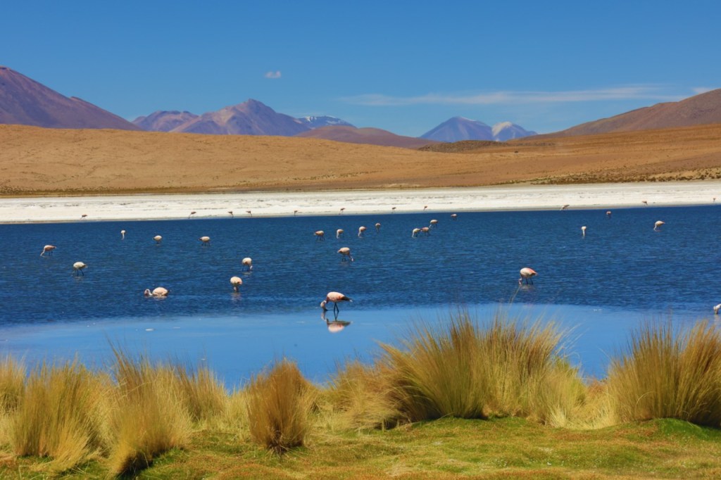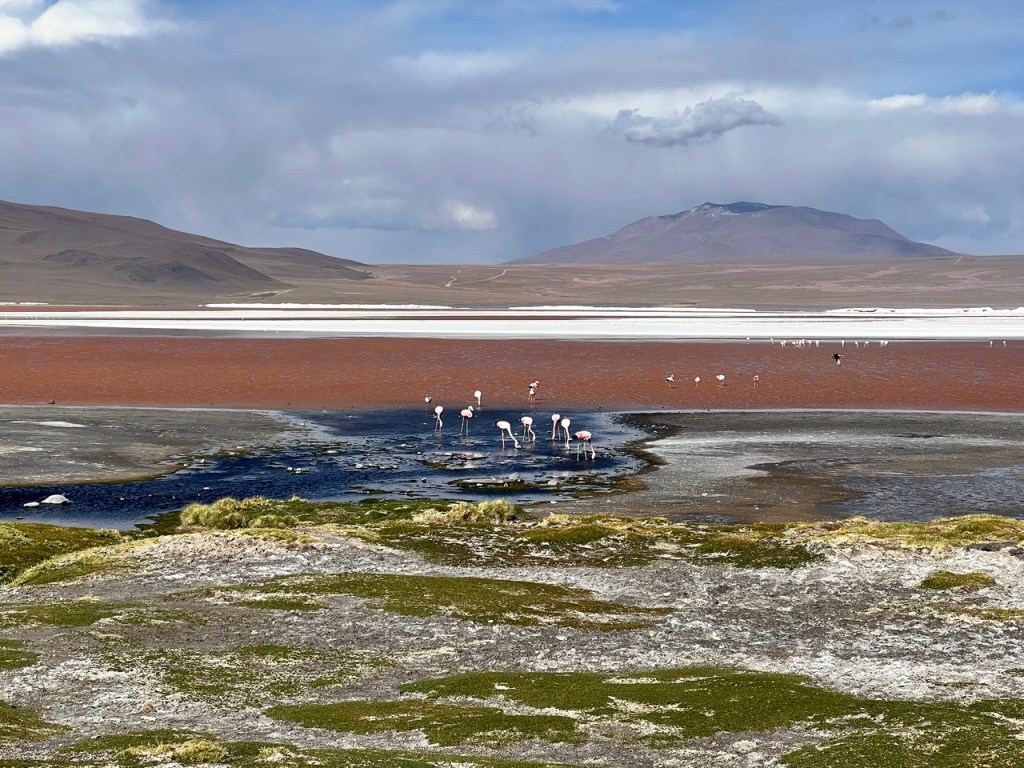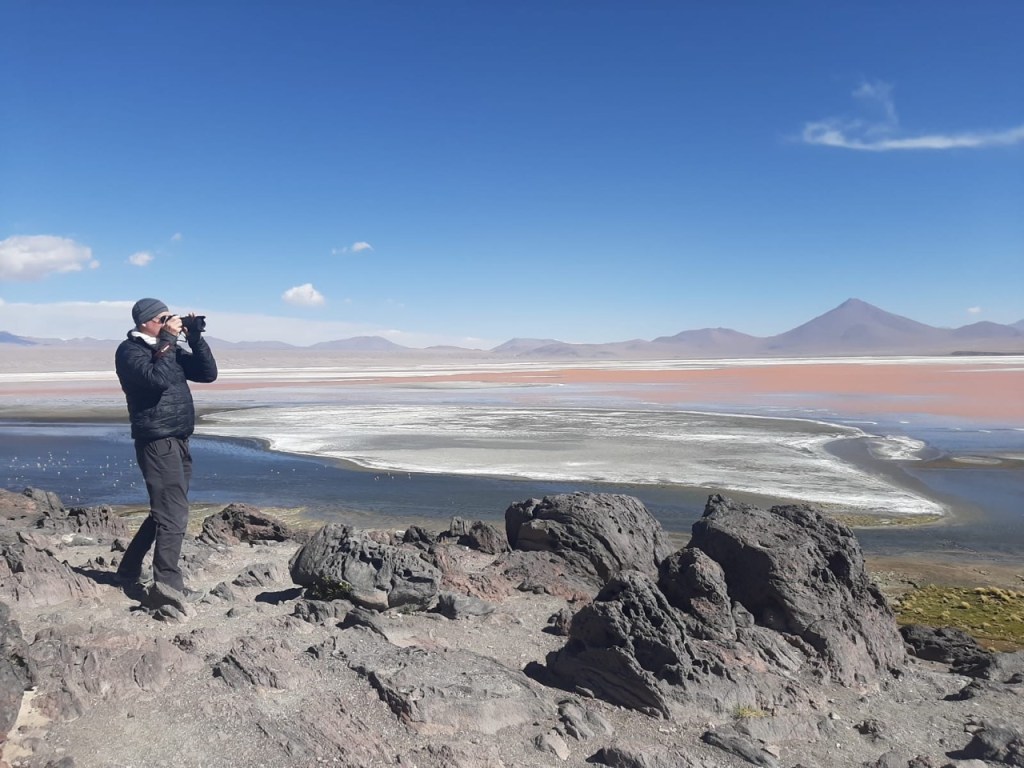 We turned off the main road and headed toward Laguna Canapa for our first look at flamingoes and then on to “Smelly Lake” for lunch with a hint of sulfur and a view of these beautiful birds.  Flamingoes thrive in these geothermal lakes, filtering out algae and small invertebrates with their highly specialized bills.  Three species live side by side here: the Chilean, Andean and the elusive James’s.  What a treat to see them outside the zoo!