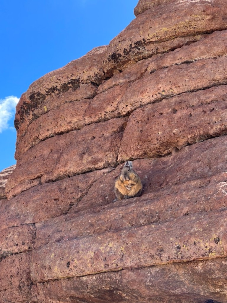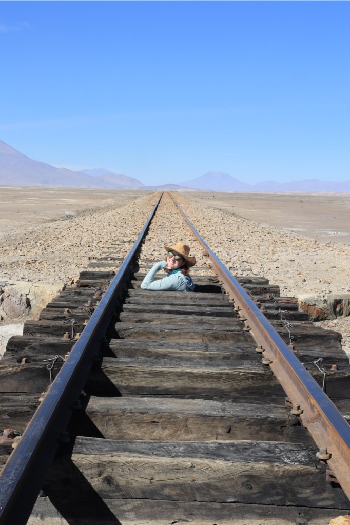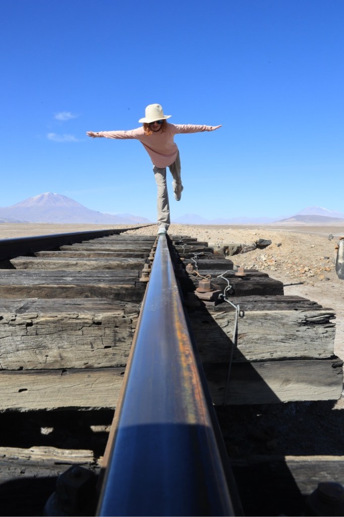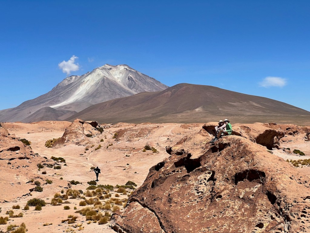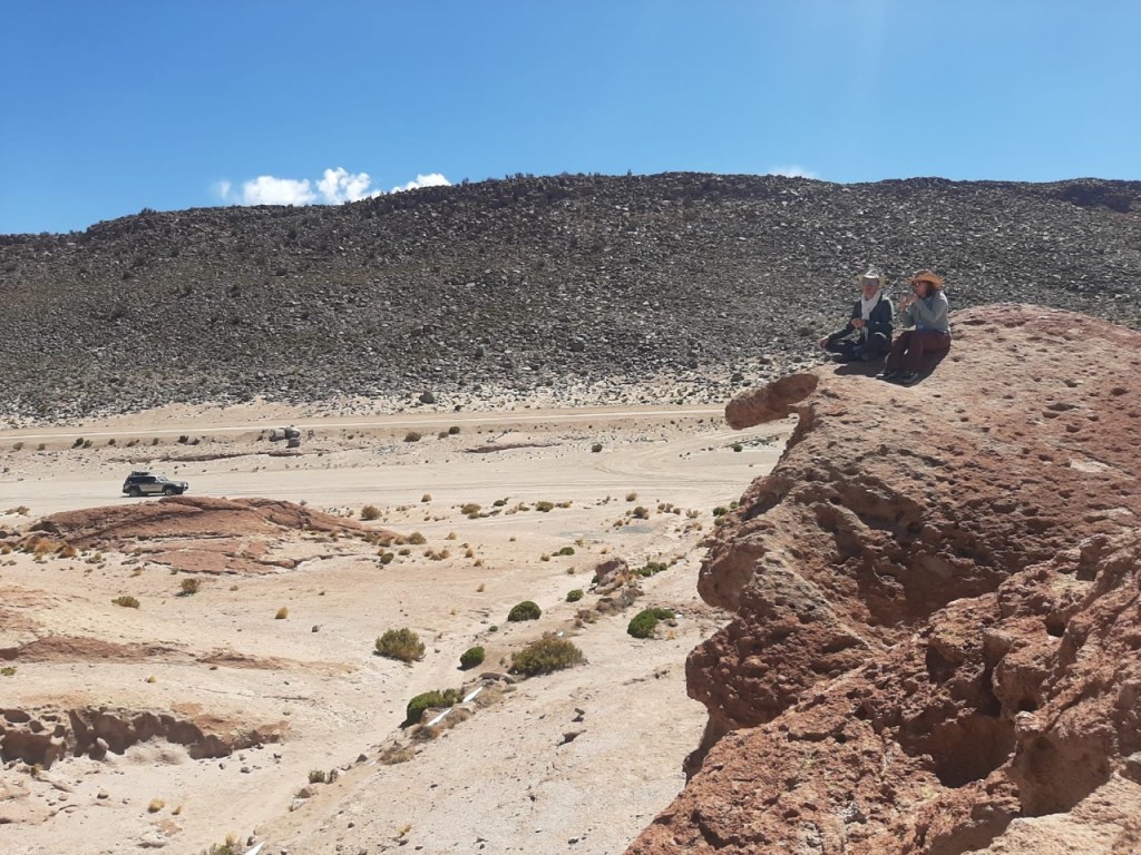 We started our long driving day through the Altiplano with a short stop for fun photos.  Train tracks ran straight and true through the landscape towards the Chilean border.  We headed south instead and followed Rte 701 at the foot of the volcanoes dominating the horizon.  A snack and baños stop led to an unexpected highlight of the day.  Pete and I savored llama sausage sandwiches while perched on a rocky outcropping and watching the smoke rise from a mildly erupting volcano.  Gwyn and Drew were happily exploring the weathered lava flow next to the road.  A moment for the memory books.