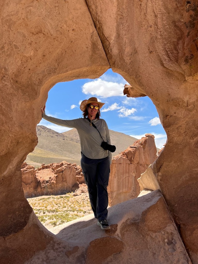 From there we went to a more commercial hot springs location for a sunrise dip in the naturally warm water before breakfast.  Kiyo departed for the Chilean border and we began the long journey back to Uyuni town.  We stopped by Laguna Verde, but unfortunately for us it was clouded over.  It gave a mysterious and ghostly feeling though, so we weren’t too upset.  The clouds lifted for our drive through the “Dali” Desert which is said to have inspired Salvador Dali’s The Persistence of Memory, the surreal “melting clock” painting.  We had a quick stop for lunch in a small mountain village, followed by a short rock climbing session in Italia Perdida.  These rocks were fun to scramble on and reminded us of Utah with its red rocks and natural bridges and windows.