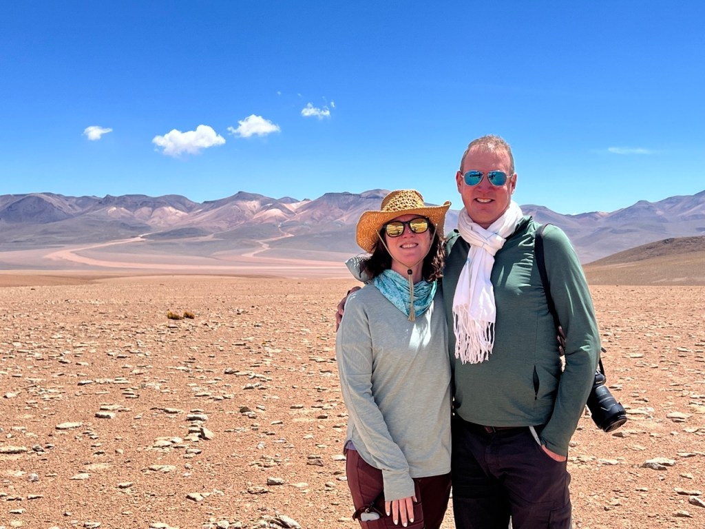 After lunch our skilled driver took us off roading through the Siloli Desert.  Pete used to do this in Utah, so we weren’t TOO concerned when we slid around sandy corners and crawled through deeply pitted river beds…  We left the green behind and added a strong wind by the time we stopped at the Rock Tree.  Finally we reached Laguna Colorada, where the shallow mineral-rich water swirls red and white.  It was stunning and so we decided to go ahead with a short scenic walk despite the high winds.  Afterwards we settled into a small hostel for a nice dinner, a few rounds of cards, and an early bedtime.  There we met a sweet couple from London on their honeymoon.  Unfortunately they were suffering from food poisoning, so Dr. Pete and our huge med kit to the rescue!  I hope they are doing well….