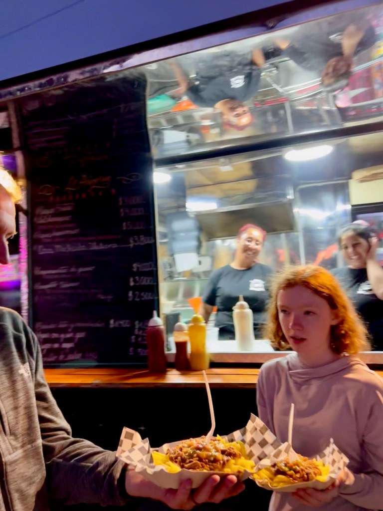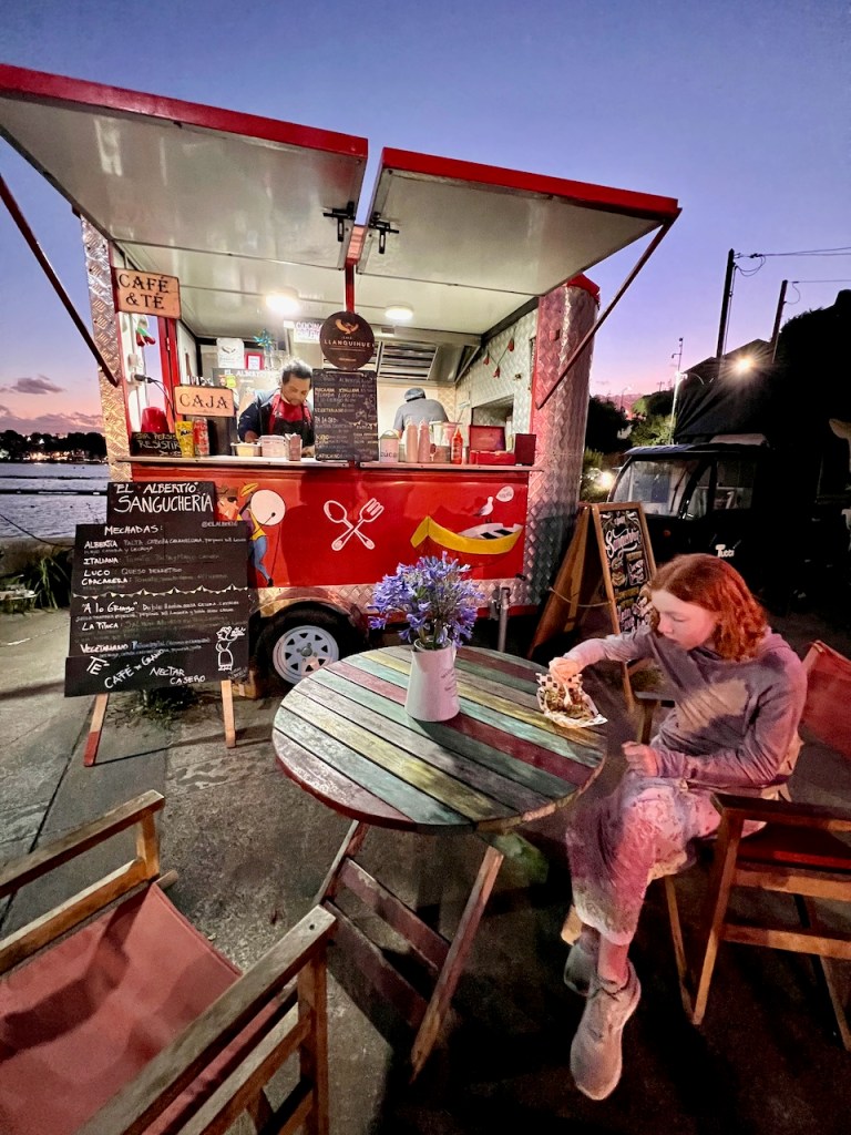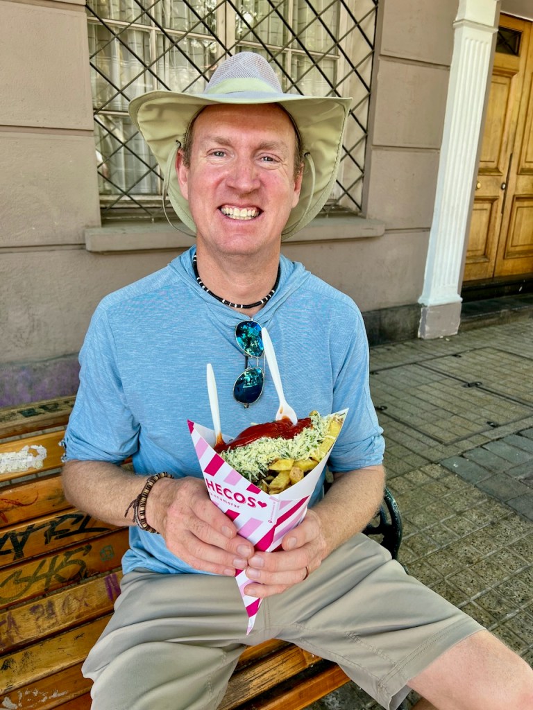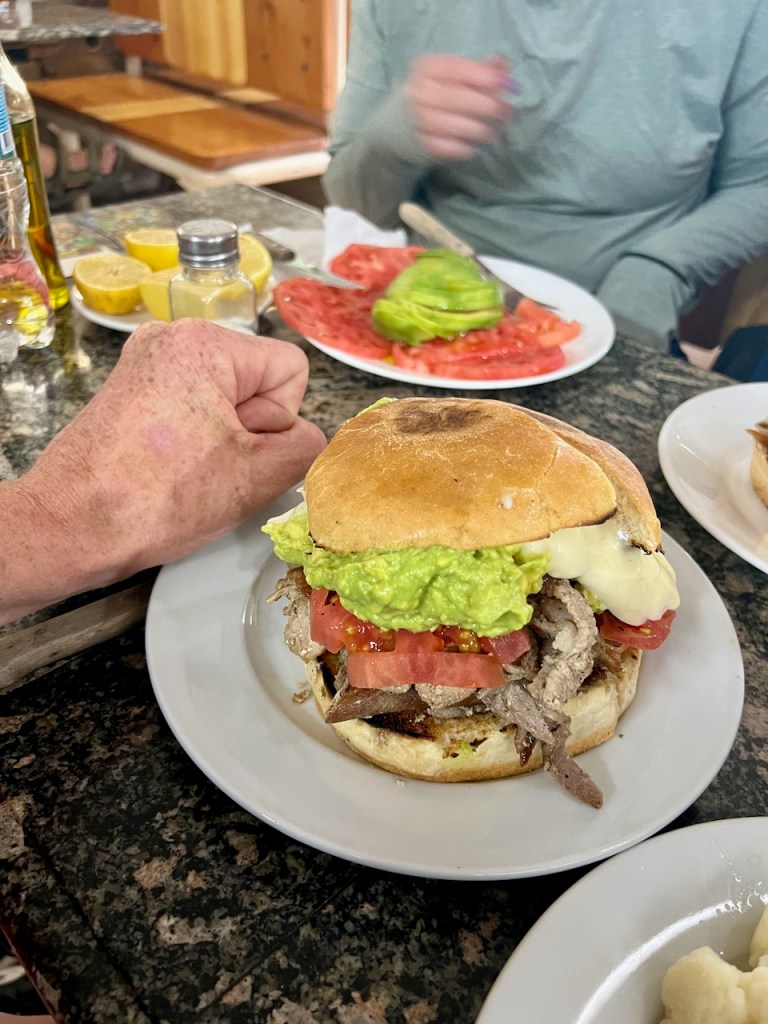 We also ate delicious meals, some simple, some extravagant.  The simple meals consisted of sanguches (the national food of Chile), which is a monster-sized sandwich weighed down with piles of meat and mountains of mayo.  We also continued our love affair with loaded fries at Papachecos. Definitely not heart or weight healthy, but delicious!  Kate and I had a date night “wine tour” at Bocanáriz that specializes in wine flights from around Chile.  Finally but not least, we immensely enjoyed the Ambrosia Bistro, a restaurant we found from watching “Feed Phil” on Netflix (if you haven’t seen that show, it’s worth a watch for foodie travel with a healthy dose of quirkiness). The meal was outstanding.  We were lucky to sit at the bar to watch the open kitchen making our food.  The owner and head chef Carolina Bazán chatted with us and treated us like honored friends; she even let us try a dish that wasn’t even on the current menu (stuffed squash flowers).  Drew continued to explore his new found love of burgers, Kate and I ate fresh tomatoes, garlic gazpacho and steak with mole, and Gwyn tried a little bit of everything including Uni (sea urchin) and the flowers..  We left feeling loved, stuffed, and a little star-struck.