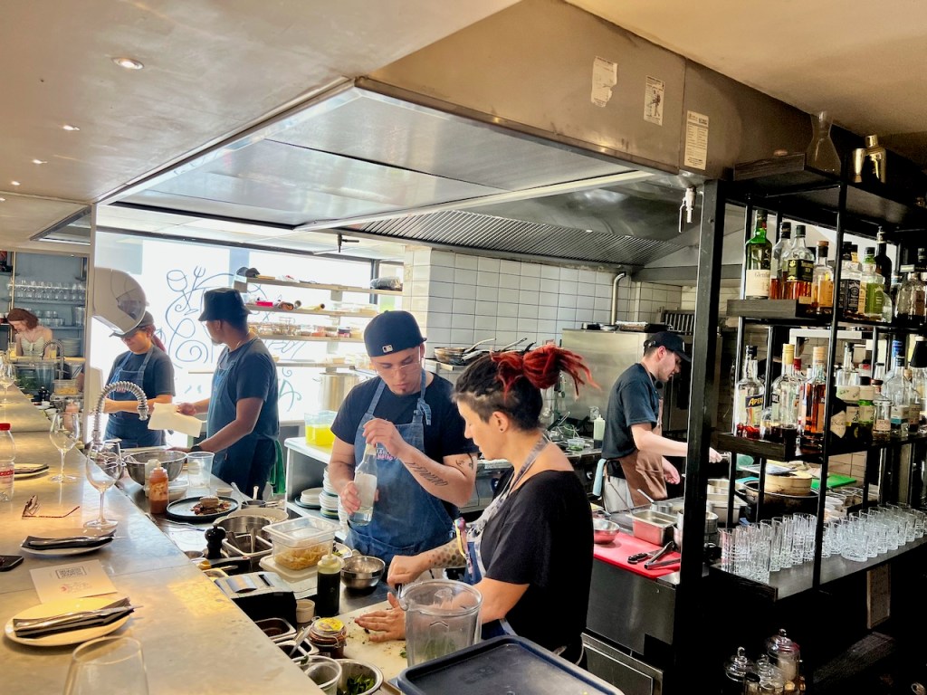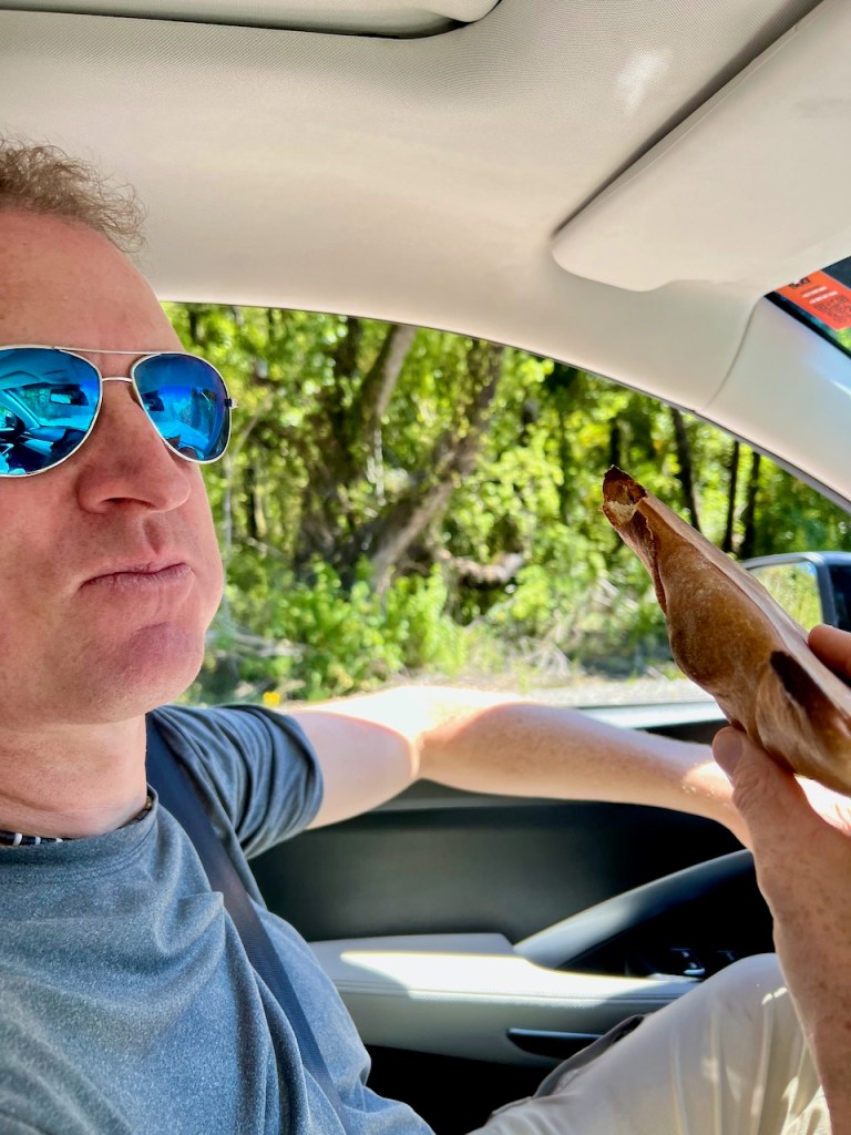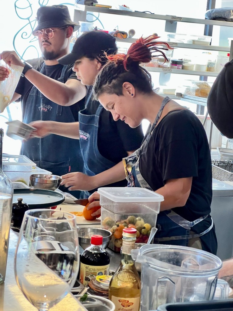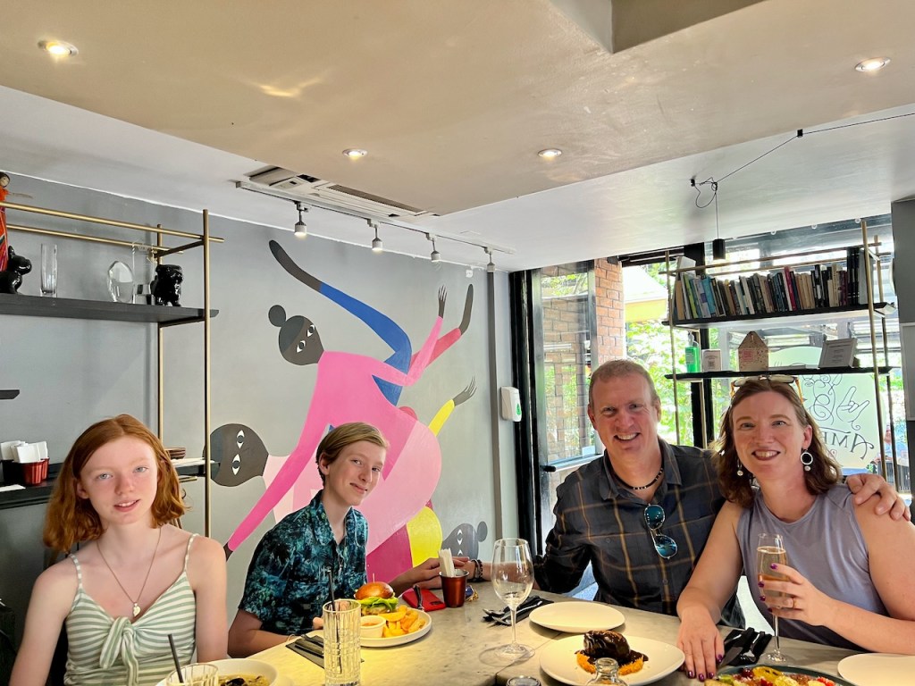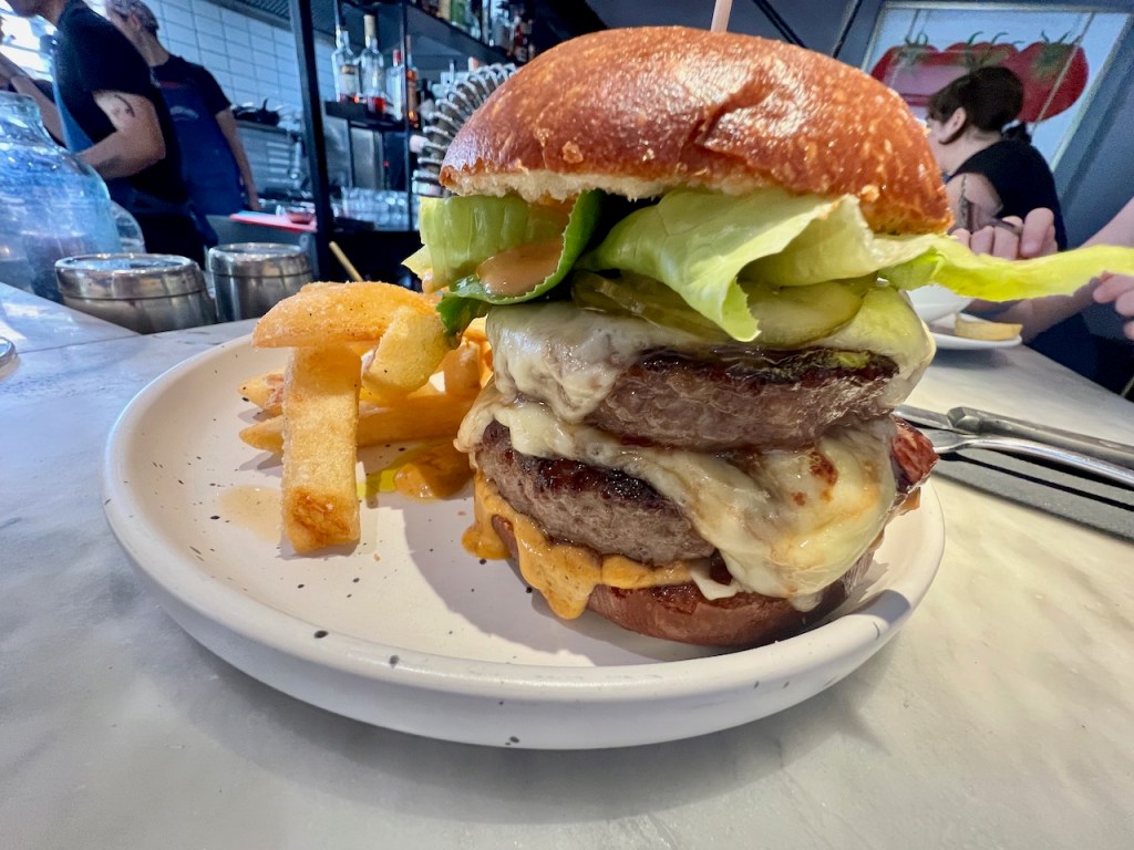 We also ate delicious meals, some simple, some extravagant.  The simple meals consisted of sanguches (the national food of Chile), which is a monster-sized sandwich weighed down with piles of meat and mountains of mayo.  We also continued our love affair with loaded fries at Papachecos. Definitely not heart or weight healthy, but delicious!  Kate and I had a date night “wine tour” at Bocanáriz that specializes in wine flights from around Chile.  Finally but not least, we immensely enjoyed the Ambrosia Bistro, a restaurant we found from watching “Feed Phil” on Netflix (if you haven’t seen that show, it’s worth a watch for foodie travel with a healthy dose of quirkiness). The meal was outstanding.  We were lucky to sit at the bar to watch the open kitchen making our food.  The owner and head chef Carolina Bazán chatted with us and treated us like honored friends; she even let us try a dish that wasn’t even on the current menu (stuffed squash flowers).  Drew continued to explore his new found love of burgers, Kate and I ate fresh tomatoes, garlic gazpacho and steak with mole, and Gwyn tried a little bit of everything including Uni (sea urchin) and the flowers..  We left feeling loved, stuffed, and a little star-struck.