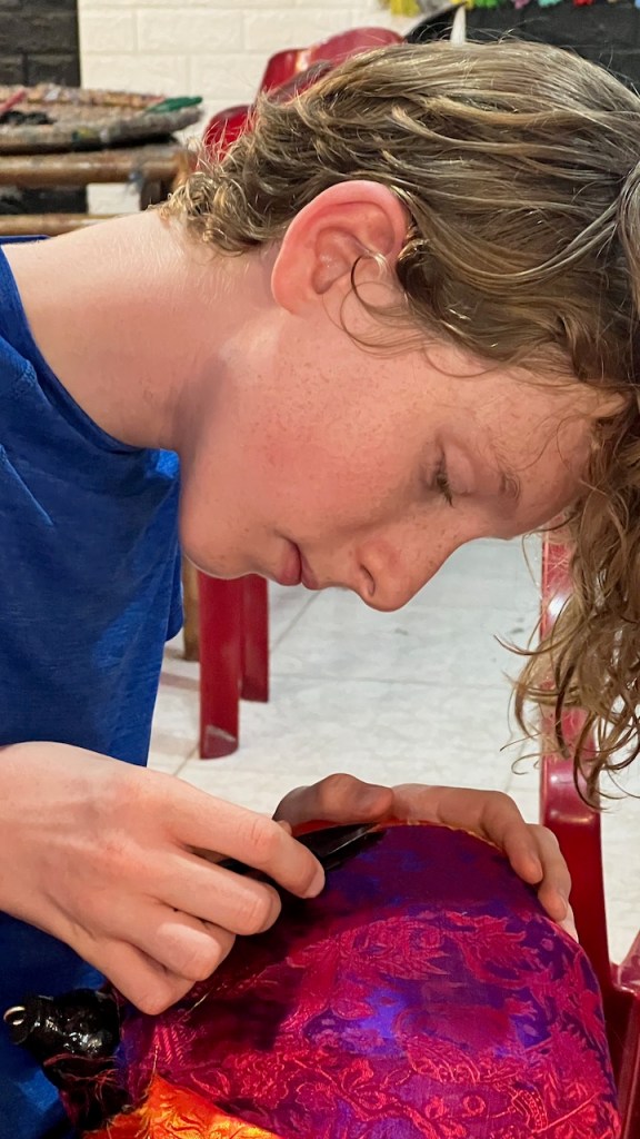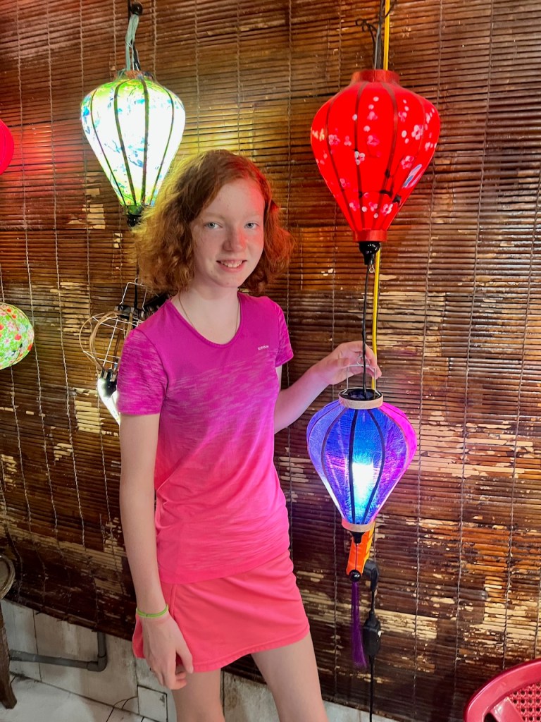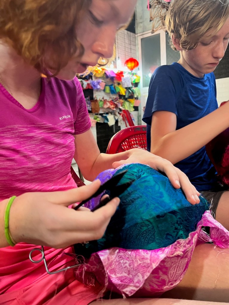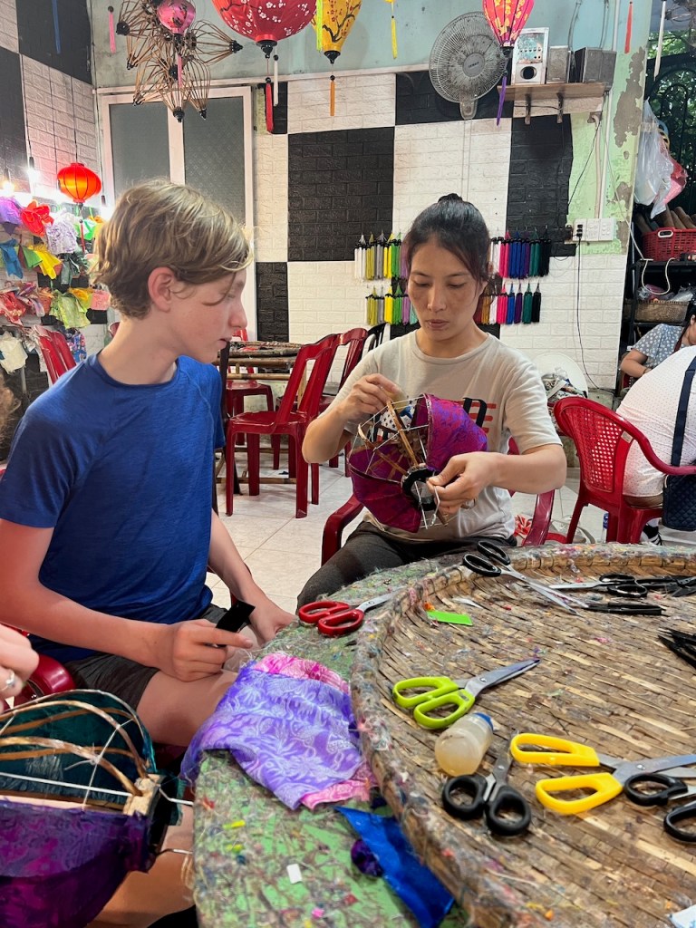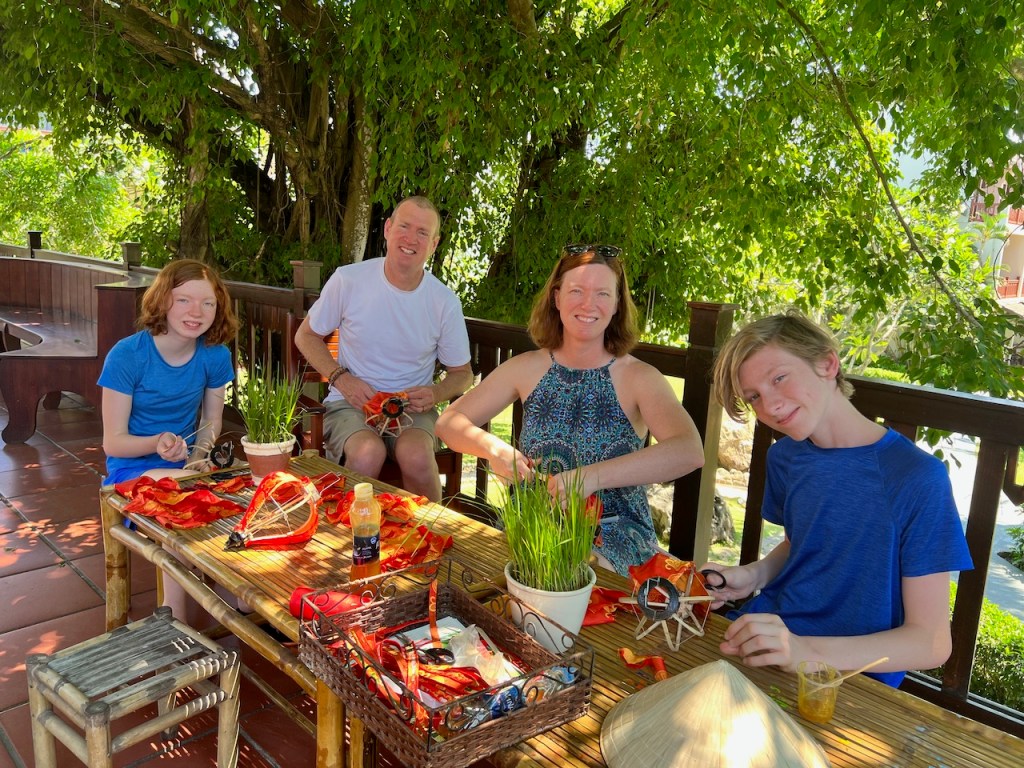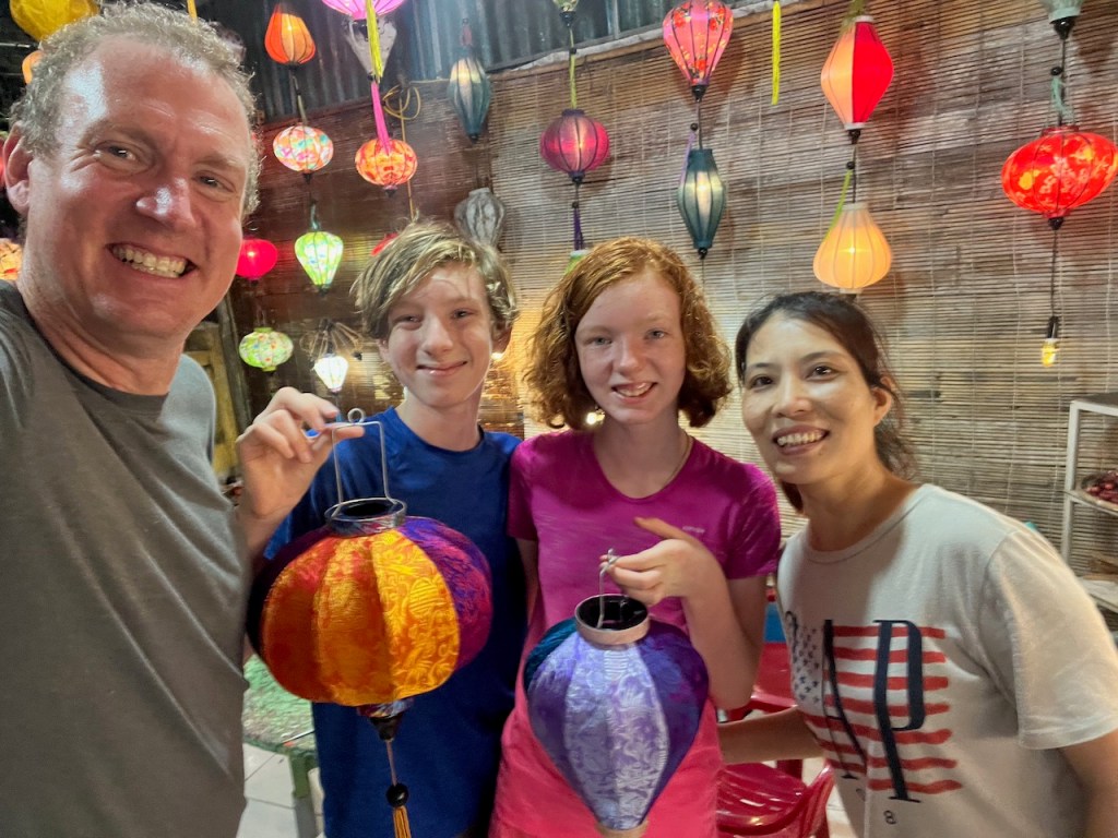 Pete and the kids took a lantern making class in Hoi A one evening, while I met up with a friend from home who also happened to be visiting the area. (She distributed Days for Girls kits and menstrual health education to rural areas, minority villages, and women’s shelters.) The lantern class with Thuy was excellent; all three loved choosing their own fabrics and frame shapes. They learned it’s not as easy as it looks and are bringing home meaningful mementos. Thank goodness my friend was generous enough to bring home a suitcase of souvenirs for us!